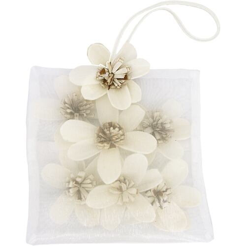 小さくて可愛いソラフラワーをオーガンジーの袋に詰めたサシェ。紐付きなのでインテリアとしてドアノブやフックにかけて楽しむ事ももできます。